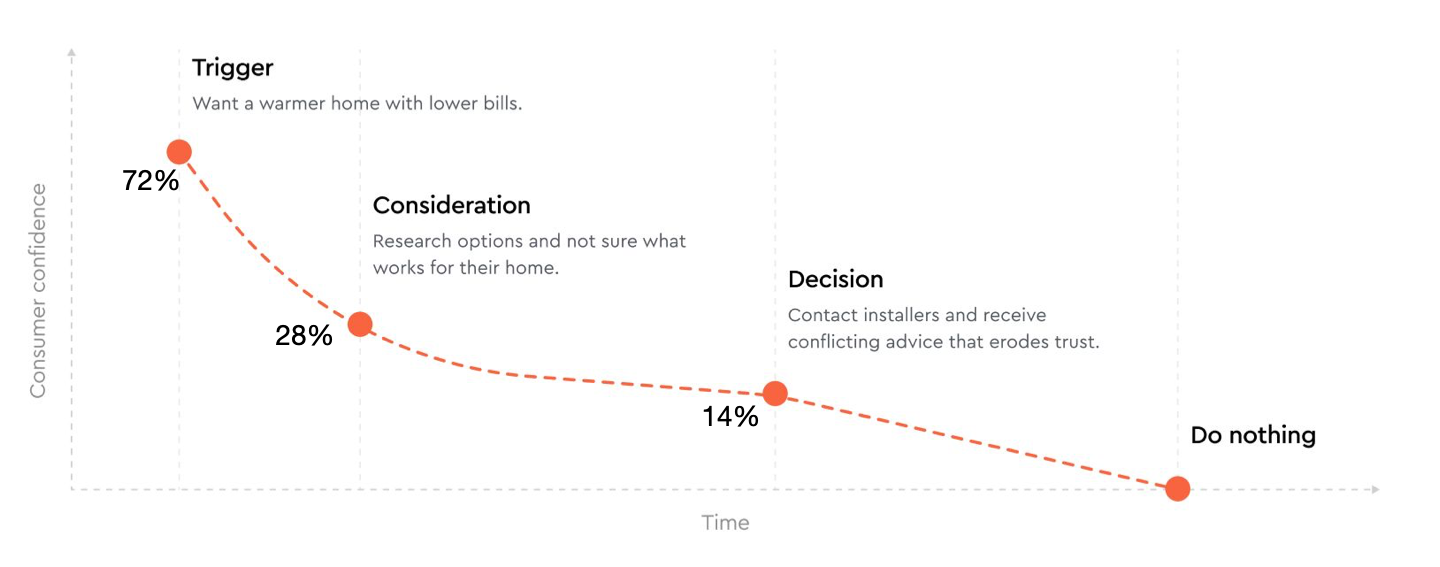 Before founding Furbnow three and a half years ago, Becky led a £30 million retrofit programme in the West Midlands. She saw, up close, exactly how this went. The interest was there: 72% of homeowners wanted to make changes. Then came the research phase, and that number dropped sharply to 28%. Then came the decision stage, and it dropped further still. Every step of the current process, she argued, is designed unintentionally to slow down momentum.